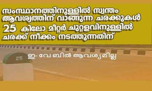 സംസ്ഥാനത്തിനുള്ളില് സ്വന്തം ആവശ്യത്തിന് വാങ്ങുന്ന ചരക്കുകള് ഇരുപത്തഞ്ചു കിലോമീറ്റര് ചുറ്റളവിനുള്ളില് ചരക്ക് നീക്കം നടത്തുന്നതിന് ഇ- വേ ബില് ആവശ്യമില്ല. പക്ഷെ, ചരക്കുകള് വാങ്ങിക്കുന്ന കടയില് നിന്നും ഉപഭോക്താവിന്റെ സ്ഥലത്തേക്ക് ഇരുപത്തഞ്ചു കിലോമീറ്ററില് കൂടുതല് ദൂരമുണ്ടെങ്കില് ഇ- വേ ബില് നിര്ബന്ധമാണ്.