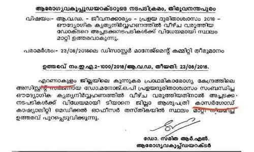 കാസർകോട്: തെക്കൻ ജില്ലകളിൽനിന്നും കാസർകോട് ജില്ലയിലേക്ക് ഉദ്യോഗസ്ഥർ എത്തുന്നത് ദുർനടപ്പിനുള്ള ശിക്ഷ അനുഭവിക്കുന്നതിന് വേണ്ടിയോ..? അതിന് കാസർകോട് എന്താ ദുർനടപ്പിനുള്ള പാഠശാലയോ.? ഈ ചോദ്യം കാസർകോട്ടുകാർ ചോദിക്കാൻ തുടങ്ങിയിട്ട് കാലം കുറേയായി. അടുത്തിടെ ഇത്തരത്തിൽ സ്ഥാമാറ്റം നേടിയ ഉദ്യോഗസ്ഥനെ കാസർകോട്ടുകാർ പ്രതിഷേധിച്ച് മറ്റു സ്ഥലങ്ങളിലേക്ക് സ്ഥലംമാറ്റ ഉത്തരവ് മാറ്റിച്ചിരുന്നു. ഇതിനു പിന്നാലെ ഇതാ പ്രളയം സംബന്ധിച്ച സ്ഥലങ്ങളിൽ ദുരിതാശ്വാസ പ്രവർത്തനം ഏകോപിപ്പിക്കുന്നതിനിടെ എറണാകുളം ജില്ലയിൽ വീഴ്ച്ച വരുത്തിയ ഡോക്ടറെ കാസർകോട് ജില്ലാ ആശുപത്രിയിലേക്ക് സ്ഥലമാറ്റിയത്. ഈ ഉത്തരവിന്റെ പകർപ്പ് സമൂഹ മാധ്യമങ്ങളിൽ വൈറലായിരിക്കുന്നു. കാസർകോട് ജില്ലയിലേക്ക് സ്ഥമാറ്റിയതിലാണ് നാട്ടുകാരുടെ പ്രതിഷേധം.