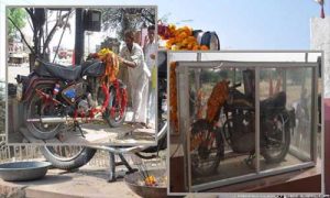 ജോധ്പൂര്(രാജസ്ഥാന്): തൂണിലും തുരുമ്പിലും ദൈവത്തെ ആരാധിക്കുന്നവരാണ് ഹൈന്ദവര്. ഒരു റോയല് എന്ഫീല്ഡ് ബുള്ളറ്റിനെ ആരാധിക്കാറുണ്ടോ? ഇന്ത്യയിലെ വടക്കുപടിഞ്ഞാറന് സംസ്ഥാനമായ രാജസ്ഥാനിലെ ഒരു ഗ്രാമം മോട്ടോര്ബൈക്കിനെ ആരാധിക്കുന്നു. രാജസ്ഥാനിലെ പാലിയിലെ നാഷണല് ഹൈവേ 65 ല് ഓം ബന്ന അല്ലെങ്കില് ബുള്ളറ്റ് ബാബ എന്നറിയപ്പെടുന്ന സ്ഥലത്താണ് വേറിട്ട ആരാധന നടക്കുന്നത്. ഇവിടെ മോട്ടര് സൈക്കിളിനായ് ഒരു ക്ഷേത്രവും നിര്മിച്ചിട്ടുണ്ട്. ഓം സിങ് രത്തോര് എന്നയാളാണ് ക്ഷേത്രം നിര്മിച്ചത്. ആരാധനാ മൂര്ത്തിയായ ഓം ബന്നയുടെ ഫോട്ടോയോടൊപ്പം ഒരു ഗ്ലാസ് ബോക്സില് ഉള്പ്പെട്ട ഒരു റോയല് എന്ഫീല്ഡ് 350 സി.സി ബുളളറ്റും ഇവിടെ കാണാം. 1991 മുതലാണ് ഇവിടെ എന്ഫീല്ഡ് ബുള്ളറ്റിന്റെ ആരാധന തുടങ്ങിയത്.