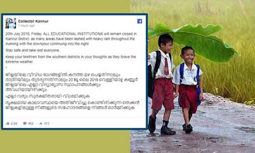 കണ്ണൂര്: കനത്ത മഴയെ തുടര്ന്ന് കണ്ണൂര് ജില്ലയില് ഇന്ന് എല്ലാ വിദ്യാഭ്യാസ സ്ഥാപനങ്ങള്ക്ക് അവധിയായിരിക്കുമെന്ന് കണ്ണൂര് ജില്ലാ കളക്ടര് അറയിച്ചു. ജില്ലയിലെ വിവിധ ഭാഗങ്ങളില് കനത്ത മഴ പെയ്തതിനാലും രാത്രിയിലും തുടരുന്നതിനാലും വെള്ളിയാഴ്ച കണ്ണൂര് ജില്ലയിലെ എല്ലാ വിദ്യാഭ്യാസ സ്ഥാപനങ്ങള്ക്കും അവധിയായിരിക്കും.