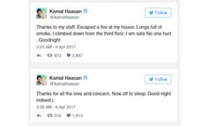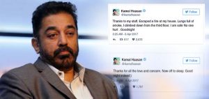 ചെന്നൈ: കമല്ഹാസന്റെ ചെന്നൈയിലെ വീട്ടില് തീപിടുത്തം. ഇന്നു പുലര്ച്ചെയായിരുന്നു തീപിടുത്തം ഉണ്ടായത്. ഇക്കാര്യം കമൽ തന്നെയാണ് ട്വിറ്ററിലൂടെ പുറത്തറിയിച്ചത്. സംഭവ സമയത്ത് കമല്ഹാസന് വീട്ടിലുണ്ടായിരുന്നു എങ്കിലും പൊള്ളലേല്ക്കാതെ രക്ഷപ്പെടുകയായിരുന്നു. ചെന്നൈ ആള്വാര്പേട്ടിലെ വീട്ടിലാണ് അഗ്നിബാധ ഉണ്ടായത്. പുക നിറഞ്ഞ് ശ്വാസം മുട്ടിയതോടെ താരത്തിനു അസ്വസ്ഥതയുണ്ടായി. അഗ്നിബാധയില് ആര്ക്കും അപകടം ഒന്നുമില്ലെന്നും താന് സുരക്ഷിതനാണെന്നും കമല്ഹാസന് തന്നെ ട്വിറ്ററില് കുറിച്ചു.