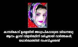 അധ്യാപികമാരുടെ മര്ദ്ദനമേറ്റ ആറാം ക്ലാസ് വിദ്യാര്ത്ഥിനി മരിച്ചതായാണ് നാട്ടുകാർ ഉൾപ്പെടെ ആരോപിക്കുന്നത്. ഇതനുസരിച്ചാണ് ചില മാധ്യമങ്ങൾ ഇതിനെ റിപ്പോർട്ട് ചെയ്തിരിക്കുന്നത്. ആരോപണം ഉയർന്നതിനെ തുടർന്ന് കളക്ടർ നേരിട്ട് ഇടപെടുകയും മൃതദേഹം വിദഗ്ദ പോസ്റ്റ് മോർട്ടത്തിനായി പരിയാരം മെഡിക്കൽ കോളേജിലേക്ക് കൊണ്ടുപോയിരിക്കുകയാണ്. ആരോപണങ്ങളിൽ എന്തെങ്കിലും വാസ്തവം ഉണ്ടോ എന്നറിയാൻ പോസ്റ്റ് മോർട്ടം റിപ്പോർട്ട് എത്തിയെങ്കിൽ മാത്രമേ പറയാൻ കഴിയൂ. മഞ്ചേശ്വരം പോലീസ് ആണ് കേസ് അന്വേഷിക്കുന്നത്.