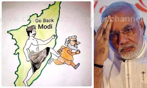 അതിന് ശേഷം ഇപ്പോൾ മോദി മധുരയിലെ എത്തുമ്പോൾ പ്രതിഷേധം കൂടുകയാണുണ്ടായത്. ‘ഗോ ബാക്ക് മോദി’ എന്ന ഹാഷ് ടാഗില് പതിനായിരക്കണക്കിന് ട്വീറ്റുകളും ഫേസ്ബുക്ക് പോസ്റ്റുകളുമാണ് പ്രചരിക്കുന്നത്. ട്വിറ്റര് ട്രെന്ഡിംഗില് ഏറ്റവും മുന്നിലും ഈ ഹാഷ് ടാഗ് തന്നെ. തമിഴ്നാടിന്റെ ഭൂപടത്തില് പെരിയാറിന്റെ ചിത്രത്തോടുകൂടിയ കാര്ട്ടൂണോടെയാണ് പ്രതിഷേധപോസ്റ്റുകള് പ്രചരിക്കുന്നത്. തമിഴ്നാട്ടിലെ കര്ഷകന് മോദിയെ നാട്ടില് നിന്ന് ചവിട്ടിപ്പുറത്താക്കുന്ന കാര്ട്ടൂണും ട്രെന്ഡിംഗാണ്. ഇതിനെതിരെ ബി.ജെ.പി പ്രവർത്തകർ രംഗത്ത് വന്നെങ്കിലും ഗുണമുണ്ടായില്ല. ‘ടി എന് വെല്കംസ് മോദി’ എന്ന ഹാഷ് ടാഗാണ് അവർ മുന്നോട്ടിവെച്ചത്. അത് അത്രയ്ക്ക് ഏറ്റില്ല.