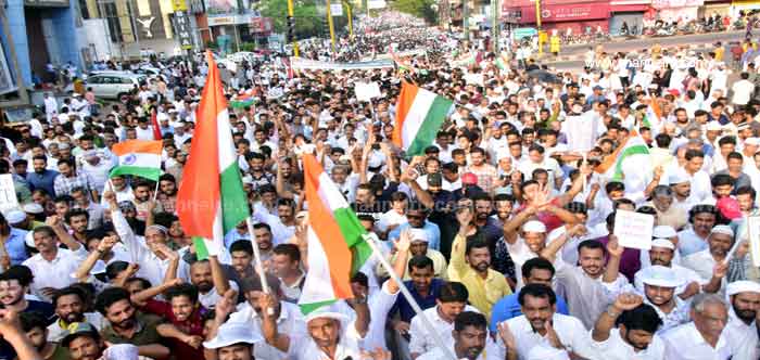 കാസർകോട്: പൗരത്വ നിയമ ഭേദഗതിക്കെതിരെ കാസര്കോട് നഗരത്തിൽ സംയുക്ത മുസ്ലിം ജമാഅത്ത് നടത്തിയ പ്രതിഷേധ റാലിയിൽ അണിനിരന്നത് ജനലക്ഷങ്ങൾ. വെള്ളിയാഴ്ച്ച വൈകിട്ട് മൂന്ന് മണിയോടെ നുള്ളിപ്പാടിയില് നിന്ന് ആരംഭിച്ച റാലി പുതിയ ബസ് സ്റ്റാന്ഡ് വഴി പഴയ ബസ്റ്റാണ്ടിലുടെ, ഹെഡ്പോസ്റ്റ് ഓഫീസില് നിന്നും കെ.പി.ആര് റാവു റോഡ്, താലൂക്ക് ഓഫീസ് വഴി എം.ജി റോഡിലൂടെ പ്രവേശിച്ച് പുലിക്കുന്ന് സന്ധ്യാരാഗം ഓപ്പൺ ഓഡിറ്റോറിയത്തിൽ സമാപിച്ചു. തുടർന്ന് നടന്ന പ്രതിഷേധ സംഗമം സമസ്ത കേരള ജംഇയ്യത്തുല് ഉലമ ജനറല് സെക്രട്ടറിയും സംയുക്ത മുസ്ലിം ജമാഅത്ത് ഖാസിയുമായ പ്രൊഫ. കെ ആലിക്കുട്ടി മുസ്ലിയാര് ഉദ്ഘാടനം ചെയ്തു.