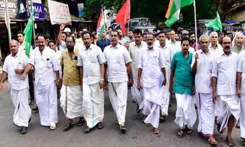 കാസര്കോട്: സാലറി ചലഞ്ചിനോട് വലിയൊരു വിഭാഗം ജീവനക്കാര് നോ പറഞ്ഞതിന് പിന്നാലെ ചാലഞ്ചില് പങ്കെടുക്കണമെന്ന് സന്ദേശം നല്കിയ ജില്ലാ പൊലീസ് മേധാവിയുടെ സന്ദേശം പിന്വലിക്കണമെന്ന് ആവശ്യപ്പെട്ട് യു.ഡി.എഫ് പ്രവര്ത്തകര് കാസര്കോട് നഗരത്തില് പ്രതിഷേധ പ്രകടനം നടത്തി. പുതിയ ബസ്സ്റ്റാര്ഡില് നിന്നും ആരംഭിച്ച പ്രകടനത്തിന് ഡി.സി.സി പ്രസിഡണ്ട് ഹക്കീം കുന്നില്, മുസ്ലിം ലീഗ് ജില്ലാ ജനറല് സെക്രട്ടറി എ. അബ്ദുല്റഹ്മാന്, എന്.എ നെല്ലിക്കുന്ന് എം.എല്.എ, യു.ഡി.എഫ് ജില്ലാ കണ്വീനര് എ. ഗോവിന്ദന് നായര്, കെ. നീലകണ്ഠന്, എ.എം. കടവത്ത്, മൂസ ബി. ചെര്ക്കള, കരുണ് താപ്പ തുടങ്ങിയവര് നേതൃത്വം നല്കി.