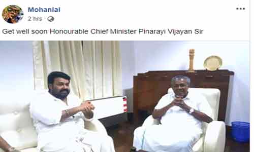താങ്കളുടെ അസുഖം എത്രയും വേഗം ഭേദമാകട്ടെ; മുഖ്യമന്ത്രിക്ക് ആശംസയുമായി മോഹന്ലാലിൻ്റെ ഫേസ്ബുക്ക് പോസ്റ്റ്
