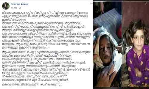 ദിവസങ്ങളോളം പട്ടിണിക്കിട്ടും പീഡിപ്പിച്ചും കൊല്ലാന് മാത്രം എട്ടു വയസ്സുകാരി ചെയ്ത തെറ്റ് എന്താണ്? കശ്മീരി ആയതോ, മുസ്ലീമായതോ ഷിംന അസീസ് ചോദിക്കുന്നു. മകളൊന്ന് ഇവിടെയുമുണ്ട്, പേടിയാകുന്നുവെന്ന ഭയപ്പാടും ഷിംന അസീസ് തന്റെ കുറിപ്പിലൂടെ പങ്കുവയ്ക്കുന്നുണ്ട്. രാജ്യത്തെ ഒന്നടങ്കം നടുക്കിയ സംഭവത്തില്, ദേശഭേദമില്ലാതെ കലാ- സാംസ്കാരിക- സാമൂഹിക- കായിക രംഗത്തുള്ളവര് പ്രതിഷേധം അറിയിച്ചുകൊണ്ടിരിക്കുകയാണ്.