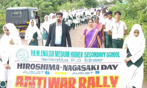 ഒന്നരലക്ഷത്തോളം മനുഷ്യരെ നിമിഷാര്ദ്ധംകൊണ്ട് ആ ‘ചെറിയകുട്ടി’ എന്ന ബോംബ് ചുട്ടു ചാമ്പലാക്കിയിരുന്നു. ഹിരോഷിമ ദിനാഘോഷത്തിന്റെ ഭാഗമായി നെല്ലിക്കട്ട പി.ബി.എം ഇംഗ്ലീഷ് മീഡിയം ഹയര് സെക്കണ്ടറി സ്കൂളില് സോഷ്യല് ക്ലബ്ബിന്റെ ആഭിമുഖ്യത്തില് യുദ്ധവിരുദ്ധ റാലി നടത്തി. പ്രിന്സിപ്പല് നിസാം ബോവിക്കാനം, അധ്യാപകരായ രമ, ഗോപി, തഫ്സീര് തുടങ്ങിയവര് റാലിക്ക് നേതത്വം നല്കി.