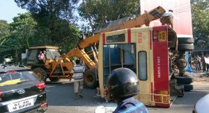 പരിക്കേറ്റവരെ കോലഞ്ചേരി, മുവാറ്റുപുഴ, പെരുമ്പാവൂര് എന്നിവിടങ്ങളിലെ സ്വകാര്യ ആശുപത്രികളില് പ്രവേശിപ്പിച്ചു. ഷാപ്പുംപടി സ്റ്റോപ്പില് റോഡ് കുറുകെ കടക്കാന് ശ്രമിച്ച സ്കൂട്ടര് യാത്രക്കാരിയെ രക്ഷിക്കാന് ശ്രമിക്കുന്നതിനിടെയാണ് ബസ് മറിഞ്ഞത്.