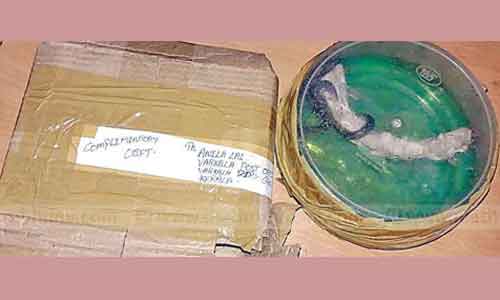 അതിനുള്ളില് എന്തോ അനങ്ങുന്നതായുള്ള സംശയത്തെത്തുടര്ന്ന് ജീവനക്കാരെത്തി പരിശോധിച്ചപ്പോഴാണ് പാമ്പാണെന്നു മനസിലായത്. പോലീസെത്തി സമ്മാനം സ്റ്റേഷനിലേക്കു കൊണ്ടുപോയി. വനംവകുപ്പ് ഉദ്യോഗസ്ഥരെത്തി പരിശോധിച്ചു. ചുരുട്ട വിഭാഗത്തില്പ്പെട്ട പാമ്പാണ് പാത്രത്തിലുണ്ടായിരുന്നത്. പാമ്പിനെ സമ്മാനമായി എത്തിച്ചതു തന്നെ അപായപ്പെടുത്താനാണെന്നു കാണിച്ച് അനിലാ ലാല് പോലീസിനു പരാതി നല്കി. സമ്മാനം പോസ്റ്റോഫീസില് കൊണ്ടുവച്ചയാളെ സി.സി.ടി.വി.യുടെ സഹായത്തോടെ കണ്ടെത്താനുള്ള ശ്രമത്തിലാണ് പോലീസ്.
