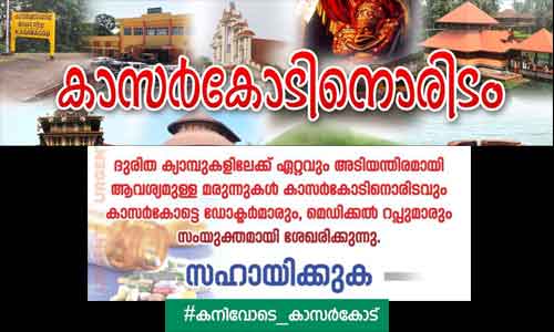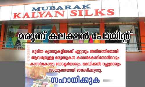 എറണാകുളത്തെ ക്യാമ്പിലേക്കും കോഴിക്കോട് ബീച്ച് ഹോസ്പിറ്റലിലെ ഡോക്ടര് അജ്മലുമായി സഹകരിച്ചും കാര്യങ്ങള് ചെയ്യാന് സാധിക്കും. മരുന്നുകള് നല്കുന്നവര്ക്ക് പ്രമുഖ വസ്ത്ര വ്യാപാര സ്ഥാപനമായ കാസര്കോട് മുബാറക് സില്കില് മെഡിസിന് കലക്ഷന് പോയിന്റ് ഒരുക്കിയിട്ടുണ്ട്. ഉദാരമതികള് സൗകര്യം പരമാവധി പ്രയോജനപ്പെടുത്തണം.