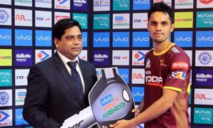 കാസര്കോട്: പ്രോ കബഡി ലീഗ് മത്സരത്തില് യു.പി. യോദയ്ക്കു വേണ്ടി ജഴ്സിയണിഞ്ഞത് കാസര്കോട് ഉദുമ അച്ചേരി സ്വദേശി സാഗര് ബി.കൃഷ്ണ. കഴിഞ്ഞ ദിവസം ബംഗാള് വാരിയേഴ്സിനെതിരേയുള്ള മത്സരത്തില് മികച്ച ഡിഫന്ഡറായി ഈ ഇരുപത്തിയാറുകാരനെയാണ് തിരഞ്ഞെടുത്തത്. സമ്മാനമായി ഇരുചക്രവാഹനവും ലഭിച്ചു. സാഗറിന്റെ പ്രകടനം ജന്മനാടായ ഉദുമയില് ആവേശത്തിന്റെ അലയൊലി തീര്ത്തു. ബംഗാള് വാരിയേഴ്സിനോടുള്ള കളി തോറ്റിട്ടും സാഗറിന്റെ പഴുതടച്ചുള്ള പ്രകടനമാണ് സമ്മാനത്തിന് അര്ഹമാക്കിയത്. ബാഗാളിന്റെ മികച്ച താരങ്ങളായ മനീന്ദ്രസിങ്, ജാന്കുന്ലി എന്നിവരെ സാഗറിന്റെ കരവലയംകൊണ്ട് കീഴ്പ്പെടുത്തിയത് നിര്ണായകമായി. ഇടതുവശത്തായാണ് 12 ആം നമ്പര് ജേഴ്സിയണിഞ്ഞ സാഗറിന്റെ കളിക്കളത്തിലെ സ്ഥാനം. എന്നാല് സാഗര് ടീമിനുവേണ്ടി കളംനിറഞ്ഞ് പോരാടി. പ്രഗത്ഭകളിക്കാരെക്കൊണ്ട് സമ്പന്നമായ ടീമിന് യു.പി.യോദയ്ക്കെതിരെ ഒരു ബോണസ് പോയിന്റുപോലും നേടാന് സാധിക്കാത്തത് ശ്രദ്ധേയമായിരുന്നു. 22 കളിയാണ് ഒരു ടീമിനുള്ളത്. നിലവില് സാഗറിന്റെ യു.പി.യോദയ്ക്ക് 11 കളികള് കഴിഞ്ഞ് ഗ്രൂപ്പ് ബിയില് മുന്നിട്ടു നില്ക്കുന്നു. അര്ജുന അച്ചേരി ക്ലബ്ബ് അംഗമാണ് സാഗര്.
