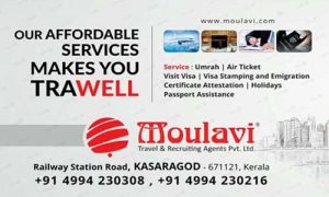 കാസർകോട് : കേരളത്തിലെ പ്രധാന ട്രാവൽ ഏജൻസിയായ മൗലവി ട്രാവൽസിന്റെ ഡിസ: 26 ലെ ബാച്ച് ഉംറക്ക് പുറപ്പെട്ടു. കാസർകോട്ടുനിന്നുള്ള തീർത്ഥാടകർ ചെവ്വാഴ്ച രാവിലെയാണ് യാത്ര തിരിച്ചത്. കാസർകോട് തായലങ്ങാടി ഖിളർ ജുമാമസ്ജിദ് മുദരിസ് ‘മുജീബ് നഈമി’യാണ് അമീർ. കാസർകോട്ട് നിന്നും റെയിൽ മാർഗ്ഗം എറണാകുളത്തേക്കും നെടുമ്പാശ്ശേരിയിൽ നിന്നും സൗദി എയർലൈൻസ് വിമാനത്തിൽ മക്കയിലേക്കുമാണ് യാത്ര.