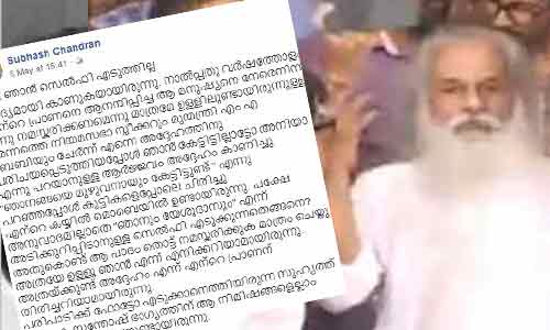 മനുഷ്യൻ്റെ സെല്ഫി ഭ്രമത്തെ രൂക്ഷമായി വിമര്ശിച്ചാണ് കുറിപ്പ് ആരംഭിക്കുന്നത്. മൊബൈല് കമ്പനികള്ക്ക് പണമുണ്ടാക്കാനായി കോടിക്കണക്കായ ഞങ്ങള് പുഴുക്കളെ സെല്ഫി എന്നൊരു അശ്ലീലം പഠിപ്പിച്ചുവച്ചിരിക്കുകയാണെന്ന് സുഭാഷ് ചന്ദ്രന് പറയുന്നു. പണ്ട് ഇന്ത്യക്കാരായ പോലീസുകാരെക്കൊണ്ട് ഇന്ത്യക്കാരെ തല്ലിച്ചതച്ചിരുന്ന ബ്രിട്ടീഷുകാരെപ്പോലെ ഇപ്പോള് ഞങ്ങളുടെ മൊബെയില് ഫോണ് യജമാനന്മാരുടെ ഇംഗിതം ഞങ്ങളും നിറവേറ്റുകയാണ്. സെല്ഫി സ്റ്റിക്ക് കൊണ്ട് അടികിട്ടാഞ്ഞത് അങ്ങയുടെ ഭാഗ്യം. പാമരനാം പാട്ടുകാരന് ഏതായാലും പെറ്റ തള്ളയ്ക്കും മീതെയൊന്നുമല്ലല്ലോ എന്നു ഞങ്ങള് അലറുന്നത് അതുകൊണ്ടാണെന്നു സുഭാഷ് ചന്ദ്രന് കുറിക്കുന്നു.