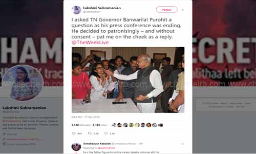 എന്നാൽ ഗവര്ണറുടെ നടപടി ശരിയായില്ലെന്ന് ലക്ഷ്മി സുബ്രഹ്മണ്യം പ്രതികരിച്ചു. തൻ്റെ അനുവാദമില്ലാതെ, അധികാരഭാവത്തോടെ ചോദ്യത്തിനുത്തരമെന്ന നിലയില് കവിളില് തലോടിയത് ശരിയായില്ലെന്ന് ലക്ഷ്മി ട്വിറ്ററില് രൂക്ഷമായി പ്രതികരിച്ചു. ഇതോടെ സംഭവം വിവാദത്തിലുമായി.
