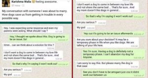 ‘ഈ പ്രശ്നത്തിനൊരു പരിഹാരത്തെപറ്റി ആലോചിച്ചു കൂടേയെന്നും തന്റെ പ്രണയജീവിതത്തില് ഒരു നായ വേണ്ടെന്നും തന്റെ അമ്മയ്ക്ക് നായ്ക്കളെ ഇഷ്ടമല്ലെന്നും പറഞ്ഞ ഭാവി വരനോട് ഇതു കൊണ്ടാണ് ഈ ബന്ധം ശരിയാകില്ല എന്ന് താന് പറയുന്നത് എന്നായിരുന്നു കരിഷ്മയുടെ മറുപടി. തീരുമാനത്തില് ഉറച്ച് നില്ക്കുന്നുണ്ടോ എന്ന് ചോദിച്ച ശേഷം വീണ്ടും ഭാവിവരന് പറയുന്നത് ഇങ്ങനെ: ‘നായസ്നേഹം ജീവിതത്തിലെ താല്ക്കാലികമായ ഘട്ടമാണ്, നിന്റെ ജീവിതത്തെ പറ്റിയാണ് നമ്മള് സംസാരിക്കുന്നത്.’ ഇതിന് മറുപടിയായി കരിഷ്മ പറയുന്നത് ഇങ്ങനെ: ‘ എനിക്ക് ഉറപ്പാണ്. നായയെ സ്വന്തമാക്കുക എന്നത് ജീവിതത്തിലെ താല്ക്കാലിക ഘട്ടമല്ല; ആര്ക്ക് വേണ്ടിയും എന്റെ വളര്ത്തുനായയെ ഞാന് ഉപേക്ഷിക്കില്ല.’അങ്ങനെയാണെങ്കില് നായയെ തന്നെ വിവാഹം കഴിക്കാന് പറഞ്ഞ ഭാവിവരനോട്, നമ്മള് തമ്മിലുള്ള ബന്ധം ശരിയാകാത്തതിന് എന്നോട് ദേഷ്യം തോന്നേണ്ട എന്ന് പറഞ്ഞാണ് കരിഷ്മ സംഭാഷണം അവസാനിപ്പിക്കുന്നത്.