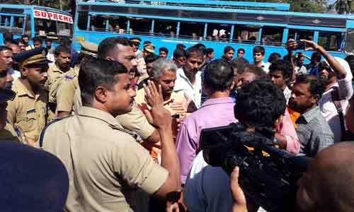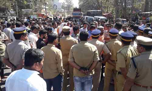 പ്രതിഷേധം ഇപ്പോഴും തുടരുകയാണ്. ഇപ്പോല് നേരിയ തോതില് ഗതാഗത സ്തംഭനവുമുണ്ട്. ചില ബസുകള് സര്വീസ് നിര്ത്തിവച്ചിരിക്കുകയാണ്. റോഡരികിലുള്ള കൊടികളും തോരണങ്ങളും തകര്ക്കുന്നത് പോലീസ് തടഞ്ഞു.