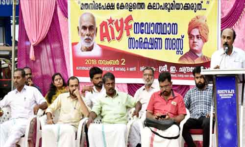 മതനിരപേക്ഷ കേരളത്തെ കലാപഭൂമിയാക്കരുത് എന്ന മുദ്രാവാക്യമുയര്ത്തി എ.ഐ.വൈ.എഫ് സംസ്ഥാന കമ്മറ്റി ആഹ്വാന പ്രകാരം ജില്ലാ കമ്മറ്റി നേതൃത്വത്തില് സംഘടിപ്പിച്ച നവോത്ഥാന സംരക്ഷണ സദസ് ഉദ്ഘാടനം ചെയ്ത് സംസാരിക്കുകയാണ് അദ്ദേഹം. ജില്ലാ പ്രസിഡന്റ് ബിജു ഉണ്ണിത്താന് അധ്യക്ഷനായി. ജില്ലാ സെക്രട്ടറി മുകേഷ് ബാലകൃഷ്ണന്, സംസ്ഥാന വൈസ് പ്രസിഡന്റ് അനിതാ രാജ്, ടി കൃഷ്ണന്, സുരേഷ് ബാബു, എം.ശ്രീജിത്ത്, അജിത്ത്. എം.സി, രാകേഷ് രാവണീശ്വരം എന്നിവര് സംസാരിച്ചു.