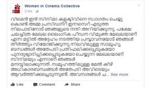 വിമെന് ഇന് സിനിമാ കളക്ടിവിനെ സ്വാഗതം ചെയ്തു കൊണ്ട് അമ്മ പ്രസിഡന്റ് ഇന്നസെറ് എടുത്ത നിലപാടിനോട് ഞങ്ങളുടെ നന്ദി അറിയിക്കുന്നു. പക്ഷേ ചലച്ചിത്ര മേഖല ലൈംഗിക പീഡന വിമുക്ത മേഖലയാണ് എന്ന മട്ടില് അദ്ദേഹം നടത്തിയ പ്രസ്താവനയോട് ഞങ്ങള് തീര്ത്തും വിയോജിക്കുന്നു.നിലവിലുള്ള സാമൂഹ്യ ബന്ധങ്ങള് അതേപടി പ്രതിഫലിക്കപ്പെടുകയോ പുനരുല്പാദിപ്പിക്കപ്പെടുകയോ ചെയ്യുന്ന മേഖലയാണ് സിനിമയും എന്നാണ് ഞങ്ങള് മനസ്സിലാക്കുന്നത്..സമൂഹത്തിലുള്ള മേല് കീഴ് അധികാരബന്ധങ്ങള് അതേപടി അവിടെയും ആവര്ത്തിക്കപ്പെടുന്നുണ്ട്. അവസരങ്ങള് ചോദിച്ചു ഈ മേഖലയിലേക്ക് കടന്നു വരുന്ന പുതുമുഖങ്ങളില് പലരും പലതരം ചൂഷണങ്ങള്ക്ക് വിധേയമാകേണ്ടി വരുന്നതും മേല് സൂചിപ്പിച്ച അധികാര ഘടന വളരെ ശക്തമായി ഇവിടെ നിലനില്ക്കുന്നതുകൊണ്ടാണ്. എന്തിന് ,ഞങ്ങളുടെ സഹപ്രവര്ത്തകരായ ചിലര് കാസ്റ്റിംഗ് കൗച്ചിനെ കുറിച്ച് ഉറക്കെ സംസാരിച്ചതും ഈ അടുത്ത കാലത്താണ്. പാര്വ്വതി, ലക്ഷ്മി റായ് തുടങ്ങിയ നടിമാര് ഇതുമായി ബന്ധപ്പെട്ട് തങ്ങളുടെ അനുഭവങ്ങള് മാധ്യമ’ങ്ങളുമായി പങ്കുവച്ചിരുന്നു. സര്ക്കാര് നിയമിച്ച ജസ്റ്റീസ് ഹേമ കമ്മീഷന് ഈ വിഷയത്തില് കാര്യക്ഷമമായ അന്വേഷണം നടത്തുമെന്നാണ് ഞങ്ങളുടെ പ്രതീക്ഷ. അതുകൊണ്ട് തന്നെ വസ്തുതകളെ കണ്ണടച്ച് ഇരുട്ടാക്കി കൊണ്ട് നടത്തുന്ന ഇത്തരം പ്രസ്താവനകളെ കുറിച്ച് ചലച്ചിത്ര മേഖലയിലുള്ളവര് ജാഗ്രത്താകണമെന്ന് wcc ആവശ്യപ്പെടുന്നു.