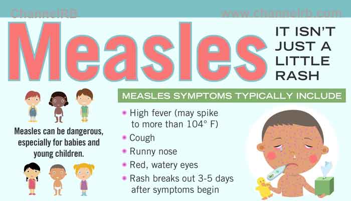 പനിയാണ് ആദ്യലക്ഷണം. ചുമ, കണ്ണ് ചുവക്കല്, ജലദോഷം എന്നിവയും ഉണ്ടാകും. നാലുദിവസം പിന്നിടുമ്പോഴേക്കും ചെവിയുടെ പിറകില് നിന്ന് തുടങ്ങി മുഖത്തേക്ക് പടര്ന്ന ശേഷം ദേഹമാസകലം ചുവന്ന അടയാളം കാണപ്പെടും. വയറിളക്കം, ഛര്ദി, ശക്തമായ വയറുവേദന, അപ്പെന്റിക്സിൻ്റെ പഴുപ്പ്, ബ്ലൈന്ഡ് നെസ്സ്, ന്യുമോണിയ, എന്സഫൈലിറ്റസ് എന്നിവയും ഉണ്ടാകാം. വയറിളക്കം കൃത്യസമയത്ത് ചികിത്സിച്ചില്ലെങ്കില് നിര്ജ്ജലീകരണം മൂലം മരണം സംഭവിക്കാം.