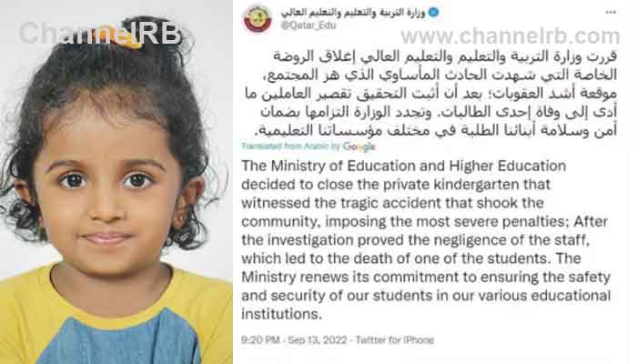 ദോഹ: സ്കൂള് ബസില് മലയാളി ബാലിക മരിച്ച സംഭവത്തില് ദോഹ അല് വക്റയിലെ സ്പ്രിങ് ഫീല്ഡ് കിന്ഡര് ഗര്ട്ടന് അടച്ചുപൂട്ടാന് ഖത്തര് വിദ്യഭ്യാസ ഉന്നത വിദ്യഭ്യാസ മന്ത്രാലയം ഉത്തരവ്. സ്കൂള് അധികൃതരില് നിന്നും ഗുരുതര വീഴ്ച കണ്ടെത്തിയതിനെ തുടര്ന്നാണ് നടപടി. ചൊവ്വാഴ്ച രാത്രിയോടെ വിദ്യഭ്യാസ മന്ത്രാലയം ട്വിറ്ററിലൂടെയാണ് തീരുമാനം അറിയിച്ചത്.
