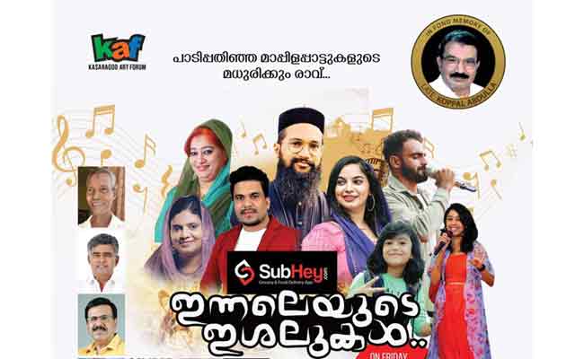 കാസര്കോട്: പതിറ്റാണ്ടുകളോളം ഉത്തരകേരളത്തിൻ്റെ കലാ, സാംസ്കാരിക രംഗത്തും മാപ്പിളപ്പാട്ട് സംഘാടന രംഗത്തും വ്യക്തി മുദ്ര പതിപ്പിച്ച കൊപ്പല് അബ്ദുല്ലയുടെ സ്മരണാര്ത്ഥം സംഘടിപ്പിക്കുന്ന “ഇന്നലെയുടെ ഇശലുകള്” ഫെബ്രുവരി 25 വെള്ളിയാഴ്ച വൈകുന്നേരം 6 മണി മുതല് കാസര്കോട് മുനിസിപ്പല് ടൗണ് ഹാളില് അരങ്ങേറും. കാസര്കോട് ആര്ട് ഫോറം സംഘടിപ്പിക്കുന്ന ഇന്നലെയുടെ ഇശലുകളില് കേരളത്തിലെ പ്രശസ്തരായ മാപ്പിളപ്പാട്ട് ഗായകര് അണി നിരക്കും.