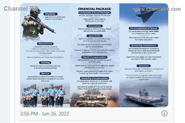 പ്രതിഷേധങ്ങള്ക്ക് ഇടയിലും അഗ്നിപഥ് പദ്ധതിയുമായി കേന്ദ്രവും, പ്രതിരോധ മന്ത്രാലയവും മുന്നോട്ട് പോവുകയും, വ്യോമസേന അഗ്നിവീരന്മാര്ക്ക് നോട്ടിഫിക്കേഷന് വിളിക്കുകയും ചെയ്തിരുന്നു.