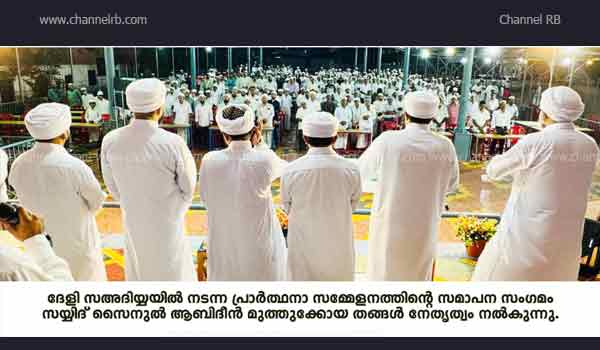 ദേളി(കാസർകോട്): റമളാന് ഇരുപത്തിയഞ്ചാം രാവില് സഅദിയ്യയില് നടന്ന പ്രാര്ത്ഥനാ സമ്മേളനം വിശ്വാസകള്ക്ക് ആത്മീയാനുഭൂതി പകര്ന്ന് പ്രൗഢമായി. വിശുദ്ധ റമളാന് പകര്ന്നു തന്ന ആത്മ ചൈതന്യവും ജീവിത വിശുദ്ധിയും നില നിര്ത്താന് വിശ്വാസികള് ജാഗ്രത പുലര്ത്തണമെന്ന് കേരള മുസ്ലിം ജമാഅത്ത് ജില്ലാ പ്രസിഡന്റ് സയ്യിദ് ഹസനുല് അഹ്ദല് തങ്ങള് പറഞ്ഞു. പാര്ത്ഥനാ സമ്മേളനത്തില് സമാപന സംഗമം ഉദ്ഘാടനം ചെയ്ത് സംസാരിക്കുകയായിരുന്നു അദ്ദേഹം. എ.പി അബ്ദുല്ല മുസ് ലിയാര് മാണിക്കോത്ത് അധ്യക്ഷത വഹിച്ചു. കെ.പി ഹുസൈന് സഅദി കെ.സി റോഡ്, മുഹമ്മദ് റഫീഖ് സഅദി ദേലംപാടി പ്രഭാഷണം നടത്തി. സമാപന പ്രാര്ത്ഥനക്ക് സയ്യിദ് സൈനുല് ആബീദീന് അല് അഹ്ദല് തങ്ങള് കണ്ണവം നേതൃത്വം നല്കി.