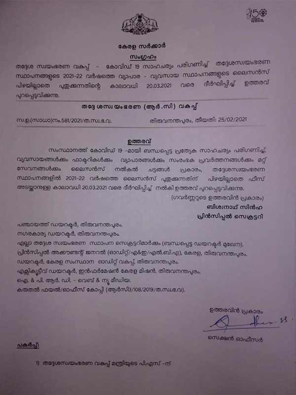 സംസ്ഥാനത്ത് കോവിഡ് 19- മായി ബന്ധപ്പെട്ട പ്രത്യേക സാഹചര്യം പരിഗണിച്ച് വ്യവസായങ്ങൾക്കും ഫാക്ടറികൾക്കും വ്യാപാരങ്ങൾക്കും സംരംഭക പ്രവർത്തനങ്ങൾക്കും മറ്റു സേവനങ്ങൾക്കും ലൈസൻസ് നൽകൽ ചട്ടങ്ങൾ പ്രകാരം തദ്ദേശസ്വയംഭരണ സ്ഥാപനങ്ങളിൽ 2021 – 2022 വർഷത്തെ ലൈസൻസ് പുതുക്കുന്നതിന് പിഴയില്ലാതെ ഫീസ് അടക്കാനുള്ള കാലാവധി 20-03-2021 വരെ ദീർഘിപ്പിച്ചുകൊണ്ടുള്ള ഉത്തരവ്.