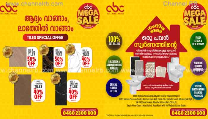 കാസർകോട്: വിദ്യാനഗർ ബി.സി റോഡുള്ള എ.ബി.സി സെയിൽസ് കോർപറേഷനിൽ ക്രിസ്മസ് ന്യൂ ഇയർ പ്രമാണിച്ചുള്ള മെഗാ സെയിലിന് തുടക്കമായി. എ.ബി.സിയുടെ 26 വാർഷികമായതിനാൽ സാധാരണ ഉപഭോക്താക്കൾക്ക്പോലും ഏറെ പ്രയോജന പ്രദമാകുന്ന നിലയിലാണ് മെഗാ സെയിൽ പ്രഖ്യാപിച്ചിട്ടുള്ളത്. “ആദ്യം വാങ്ങാം ലാഭത്തിൽ വാങ്ങാം” എന്ന തലക്കെട്ടോടെ ആരംഭിച്ചിരിക്കുന്ന ഈ മെഗാ സെയിലിൽ ടൈൽ ഉത്പന്നങ്ങൾക്ക് 50% വരെ വിലകിഴിവ് നൽകുന്നുണ്ട്. കൂടാതെ ഒരു പവൻ സ്വർണ്ണത്തിൻ്റെ വിലയിൽ ഒരു വീട്ടിലേക്കുള്ള മുഴുവൻ ടൈൽസുകളും സാനിറ്ററി ഉത്പന്നങ്ങളും ഗംഭീര ഓഫറായി നിങ്ങൾക്ക് സ്വന്തമാക്കാനാകും. ഇതിന് പുറമെ ബ്രാൻഡഡ് ഉത്പന്നങ്ങൾക്ക് സ്പെഷ്യൽ ഡിസ്കൗണ്ട്, പ്രീമിയം ക്വാളിറ്റി ഉത്പന്നങ്ങൾക്ക് കോംബോ ഓഫറും ലഭ്യമാണ്. പുതിയ സ്റ്റോക്കും ഒട്ടനവധി ഡിസൈനുകളും എ.ബി.സിയിൽ എത്തിയിട്ടുണ്ട്. ഒന്നരക്കോടി സ്ക്യൂയർ ഫീറ്റ് സ്റ്റോക്ക് നിലവിലുള്ളതായി അധികൃതർ പറഞ്ഞു. ആവശ്യക്കാർക്ക് ബൾക്ക് പർച്ചേസിനുള്ള സൗകര്യമുണ്ട്. അഡ്വാൻസ് ബുക്കിങ്ങും സ്വീകരിക്കുന്നുണ്ട്. കാസർഗോഡ് ഷോറൂമിൽ നടന്ന മെഗാ സെയിലിൻ്റെ ഉദ്ഘാടനം സഅദിയ സെന്റെർ ഇമാം മുബഷിർ ഹാഷിമി നിർവഹിച്ചു. എ.ബി.സി ഡയറക്ടർമാർ, നല്ലവരായ ഉപഭോക്താക്കൾ എ.ബി.സി ജീവനക്കാർ അടക്കം നിരവധിപേർ സംബന്ധിച്ചു. എ.ബി.സിയുടെ എല്ലാ ഷോറൂമുകളിലും ഈ ഓഫർ ലഭ്യമാണ്.